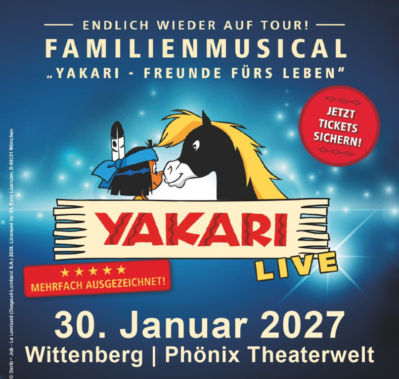 Das mitreißende und zweifach mit Sold Out Awards ausgezeichnete Familienmusical "YAKARI – Freunde fürs Leben" setzt seine Erfolgsgeschichte fort und geht ab 2026 erneut auf große Deutschlandtournee! Wenn Yakari die Bühne betritt, gibt es im Publikum kein Halten mehr! Komponist und Autor Thomas Schwab hat mit "YAKARI – Freunde fürs Leben" eine Show geschaffen, die die Herzen der Zuschauer im Sturm erobert. Mehr als 180.000 begeisterte Besucher strömten bereits in die ausverkauften Hallen und Theater, um die spannenden Abenteuer des naturverbundenen Helden und seiner Freunde Kleiner Donner, Kleiner Dachs, Müder Krieger, Regenbogen und Lindenbaum mitzuerleben.