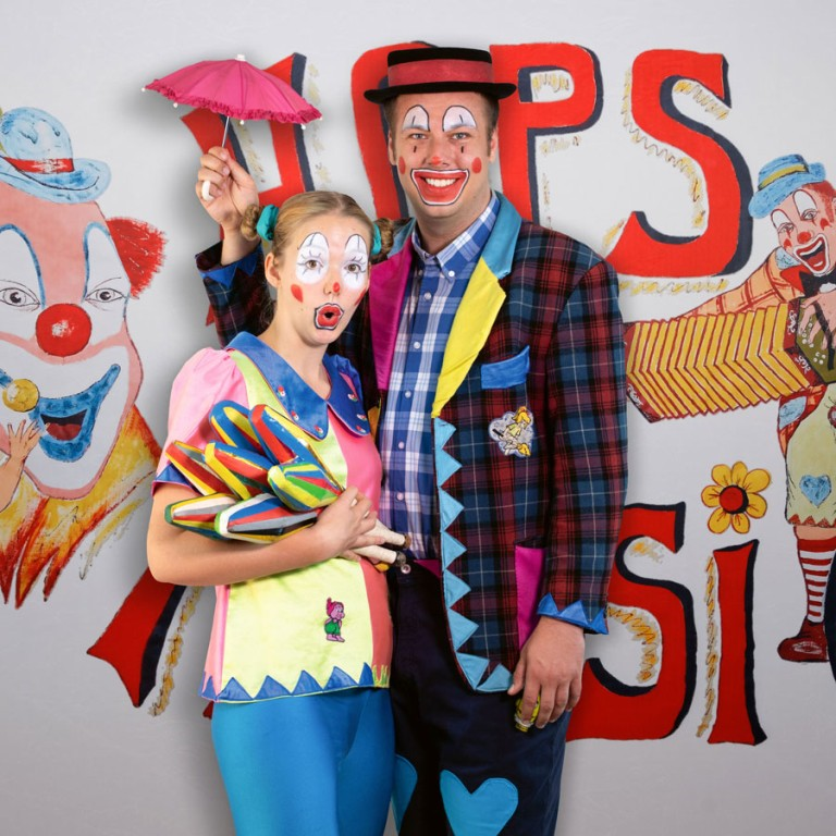 Die Clowns Hops und Hopsi präsentieren ein abwechslungsreiches und interaktives Bühnenprogramm mit Jonglage, Musik und Zauberei.